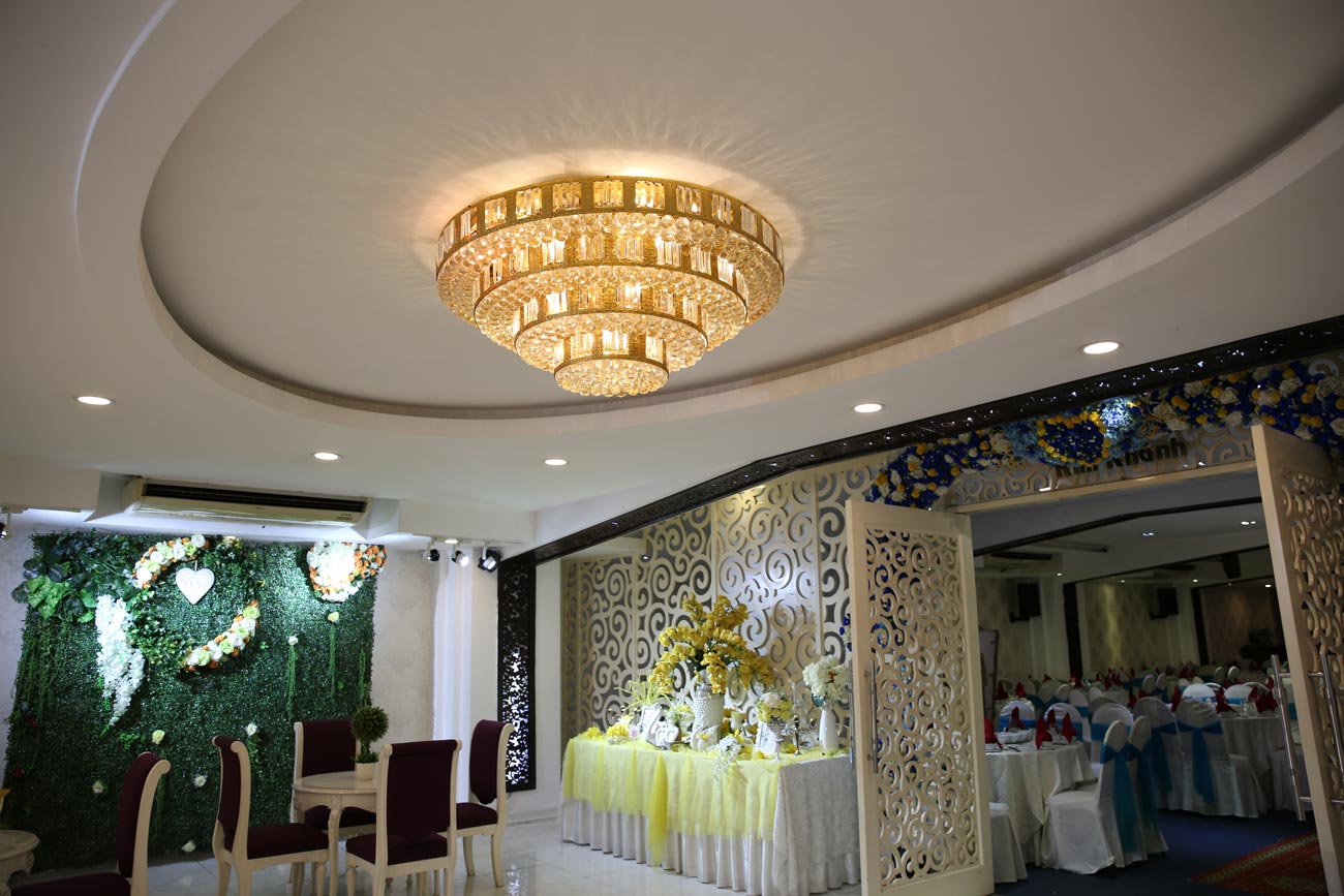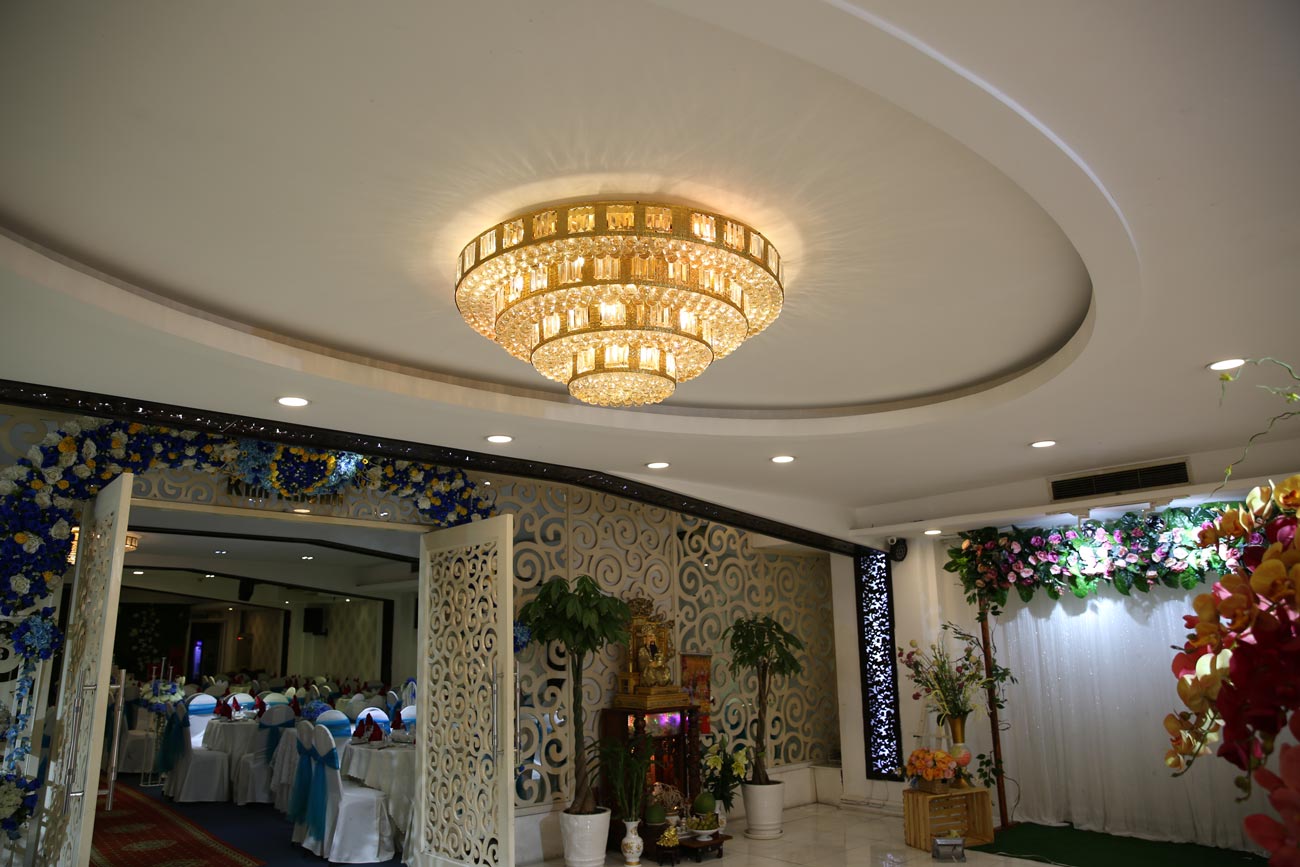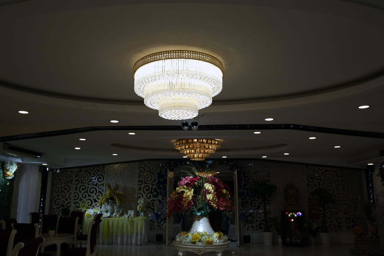 Mẫu đèn chùm pha lê được sử dụng để chiếu sáng tại một nhà hàng tiệc cưới. Đèn chùm pha lê của Venus sử dụng các hạt pha lê nhân tạo cao cấp, có độ trong suốt và phản chiếu ánh sáng lấp lánh.