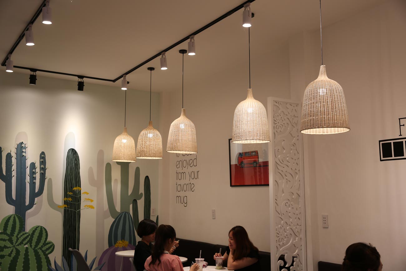 Đèn thả dạng lồng được sử dụng trong một quán cafe. Đèn trang trí của Khang Dy có rất nhiều kiểu dáng với các chất liệu khác nhau để bạn lựa chọn.