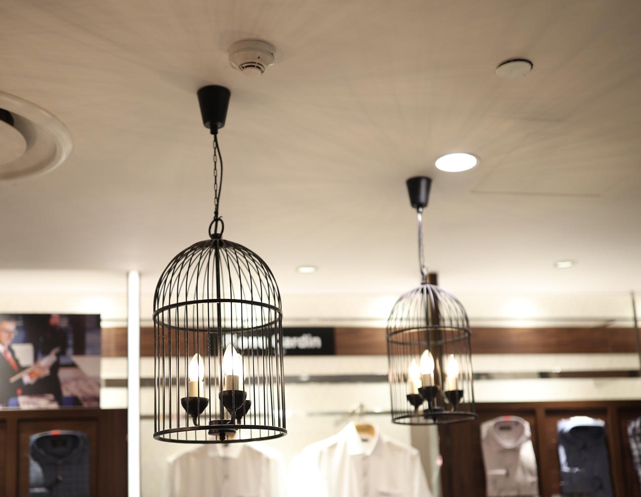 Các loại đèn thả nghệ thuật dạng lồng chim và bóng nến rất phù hợp để sử dụng trong các cửa hàng thời trang sang trọng. Đèn cung cấp ánh sáng dịu nhẹ, sự tươi mới cho không gian, và tạo được hiệu ứng hắt bóng lên tường khá đẹp mắt.