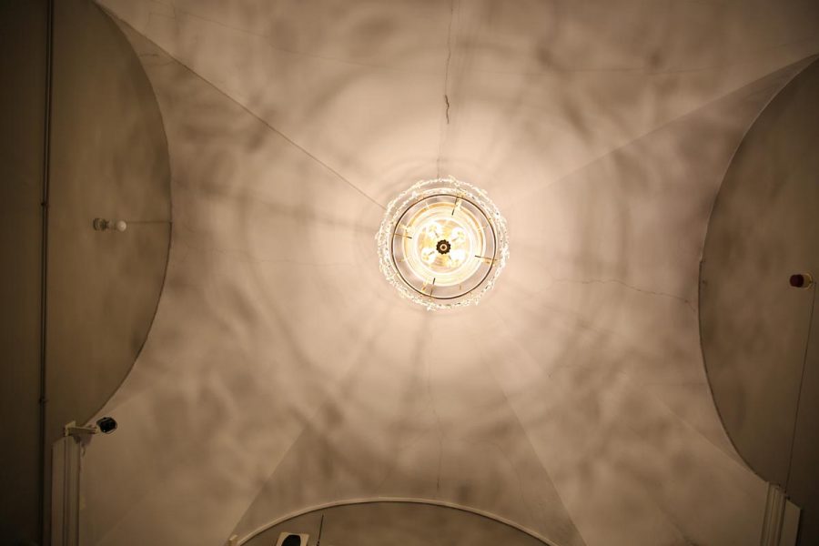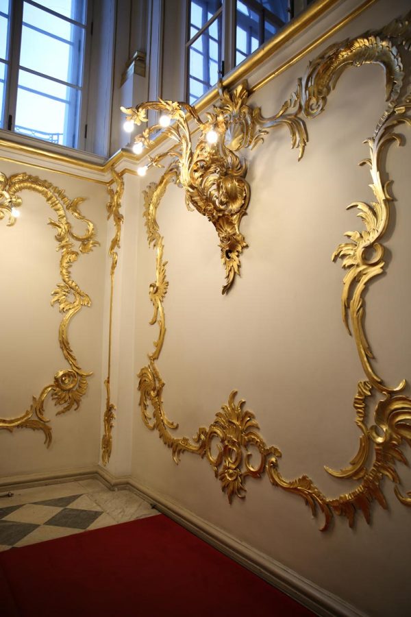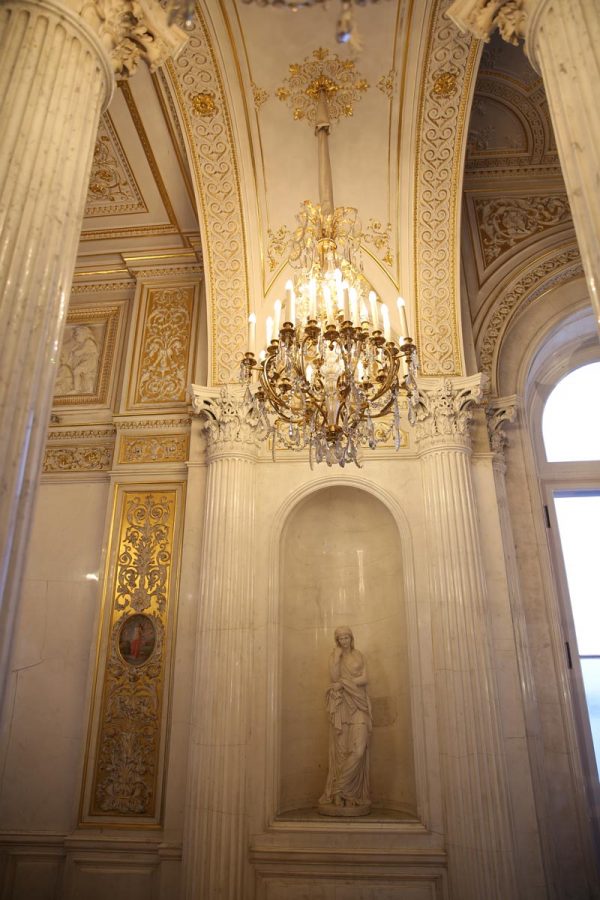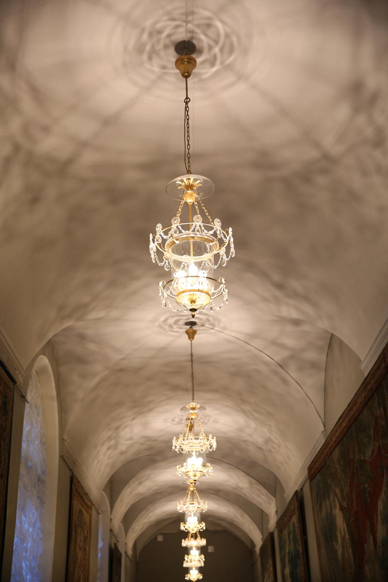 Lối đi ra khỏi cung điện được trang trí bằng những bộ đèn thả bằng đồng. Các cánh tay đưa ra khỏi bức tường đá cẩm thạch tựa như những người thiếu nữ cầm lồng đèn để soi đường cho quan khách.