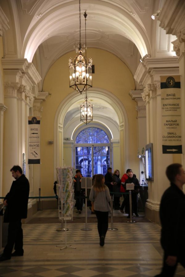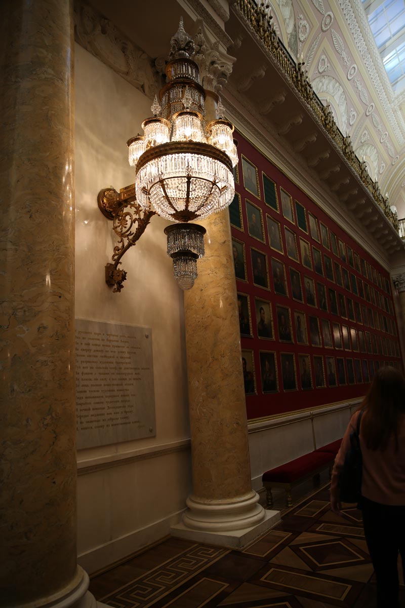 Nước Nga là nước mà mùa đông chiếm thời gian dài đến chín tháng. Nên được gọi là cung điện Mùa Đông là do nó sử dụng suốt trong các mùa lạnh giá. Mọi hoạt động đều diễn ra trong cung điện, ngay cả hoạt động nghỉ ngơi giải lao ngoài trời. Bên trên hình là dãy hành lang rất rộng, để cho các quan khách ngay cả nhà vua ngồi giải lao sau giờ làm việc. Bên trên hàng ghế là giếng trời để đón ánh sáng tự nhiên.Hành lang rộng tới mức tưởng trừng như cả một công viên trong cung điện. Đặt cạnh các ghế đá là những cây đèn đứng ngoài trời làm bằng đồng với bóng đèn hướng lên. Những bộ đèn này là sự kết hợp sáng tạo, vì chúng vừa là đèn ngoài trời đồng thời cũng là đèn sàn để trong nhà.
