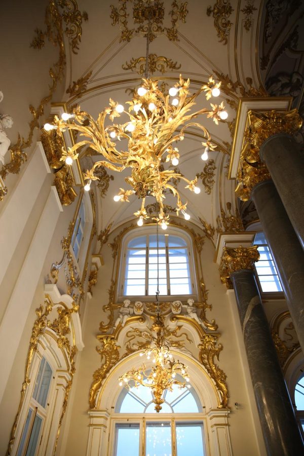 Bộ đèn này rất đặc biệt, kích thước chỉ khoảng 350mm chiều cao 400mm, nhưng được sản xuất và dành riêng cho cung điện mùa đông. Cách đây 200 năm các nhà thiết kế đèn đã có khái niệm rất chính xác về đèn trang trí là gì? Bộ đèn nhỏ này thể hiện được sự hiểu biết đó. Tuy nhỏ nhưng chúng tạo ra hiệu ứng ánh sáng rất tuyệt vời, lung linh một cách diệu kỳ. Phần nắp nhỏ phía trên thể hiện đươc sự tinh tế của bộ đèn. Nhiều người Việt sẽ cho rằng cái nắp đó để che bụi, che côn trùng, nhưng điều đó hoàn toàn không đúng. Vì ở Nga không khí rất sạch sẽ, thì làm gì có bụi mà bay vào, che côn trùng lại càng không đúng hơn.