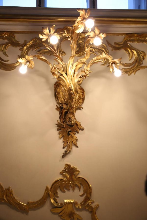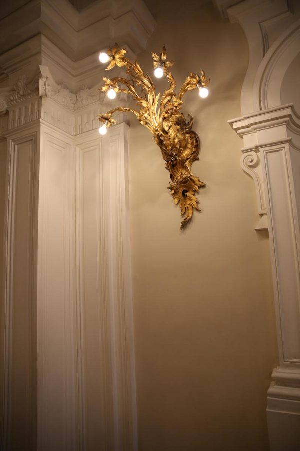 Cây đèn vách bằng đồng, có năm tay, hướng từ trên xuống, theo thế áp đảo, áp đặt uy quyền đối với người nhìn. Chúng được lắp đặt ở cầu thang đón khách, khi nhìn vào chúng ta sẽ nhận được một giác cảm như một bàn tay đang vươn lên cao và tóm lấy chúng ta.