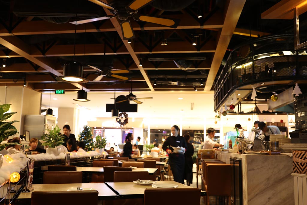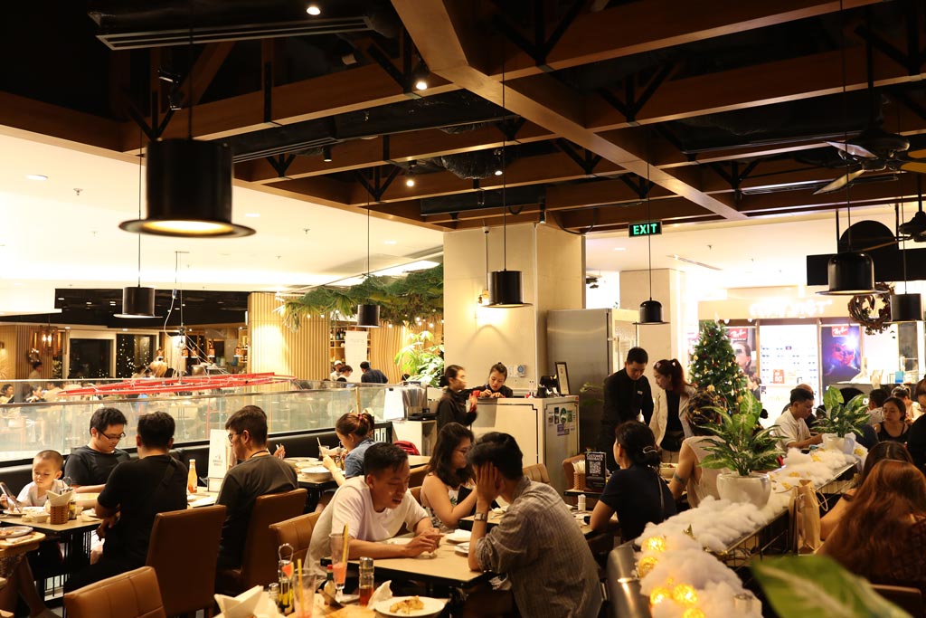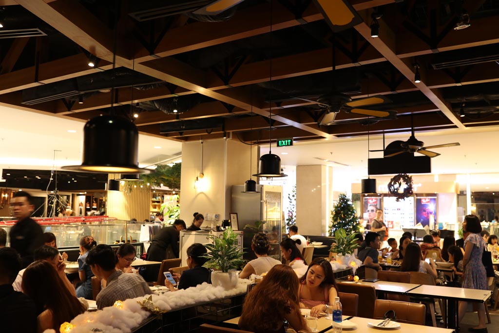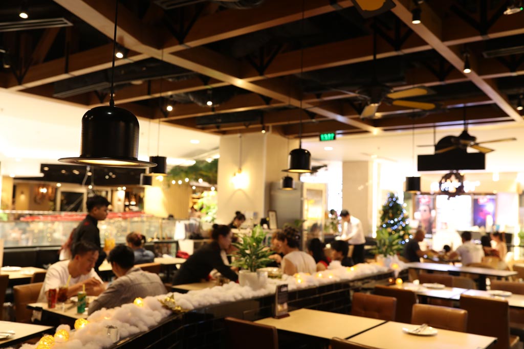Nội thất của quán như đã nói rất thoáng, quán sắp xếp theo hình chữ L. Đuôi của chữ L nằm ngay cầu thang máy cuốn, chiều dài của cạnh L là góc nằm song song với đường Pastuer. Đỉnh của chữ L là hướng quay sang đường Nguyễn Huệ. Góc phải của chữ L là nhà bếp chế biến. Nhà bếp được quây kín xung quanh bằng kính, do đó bạn có thể vừa thưởng thức đồ ăn vừa quan sát được các đầu bếp đang chế biến những món ăn.
