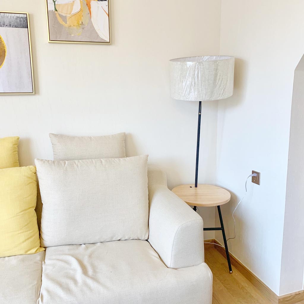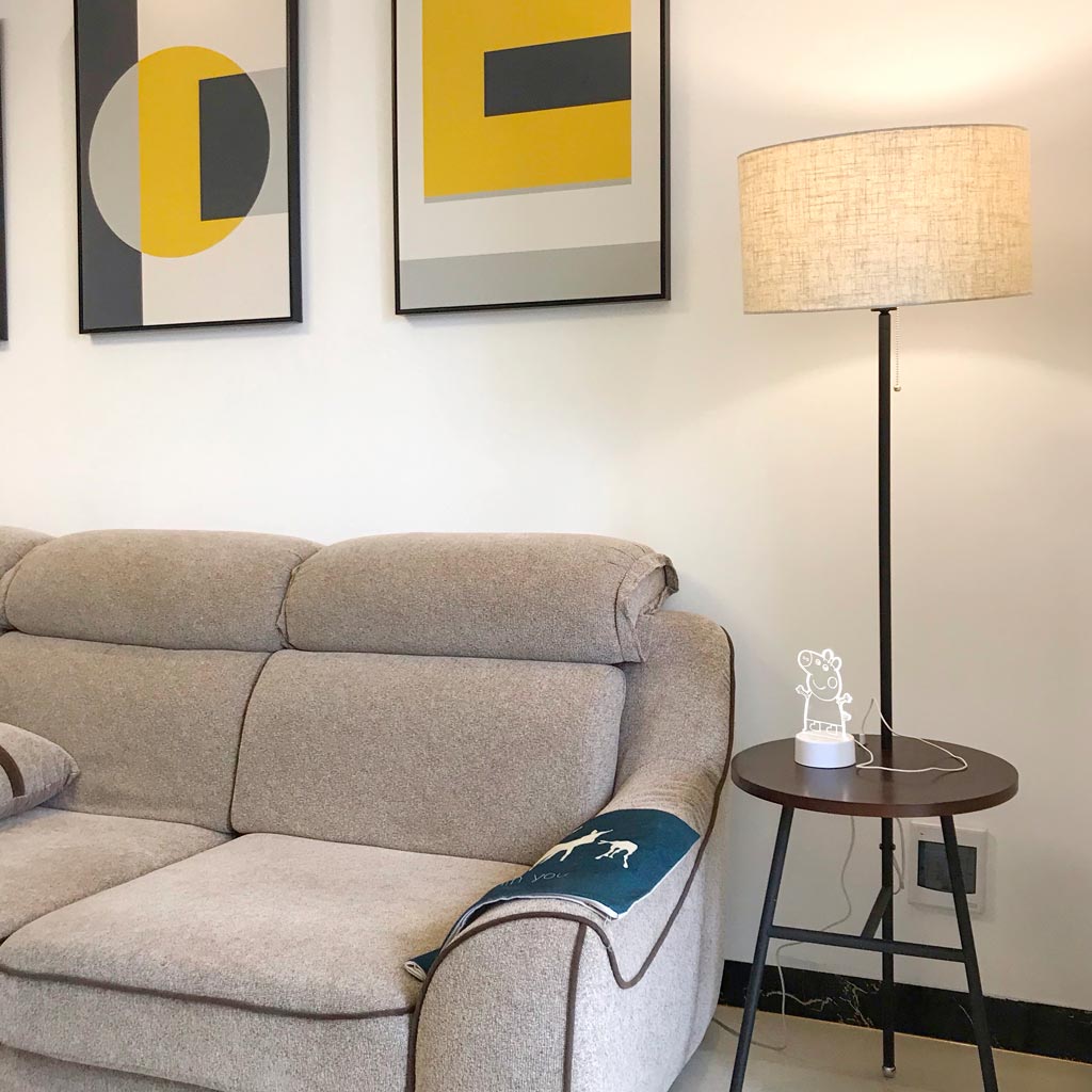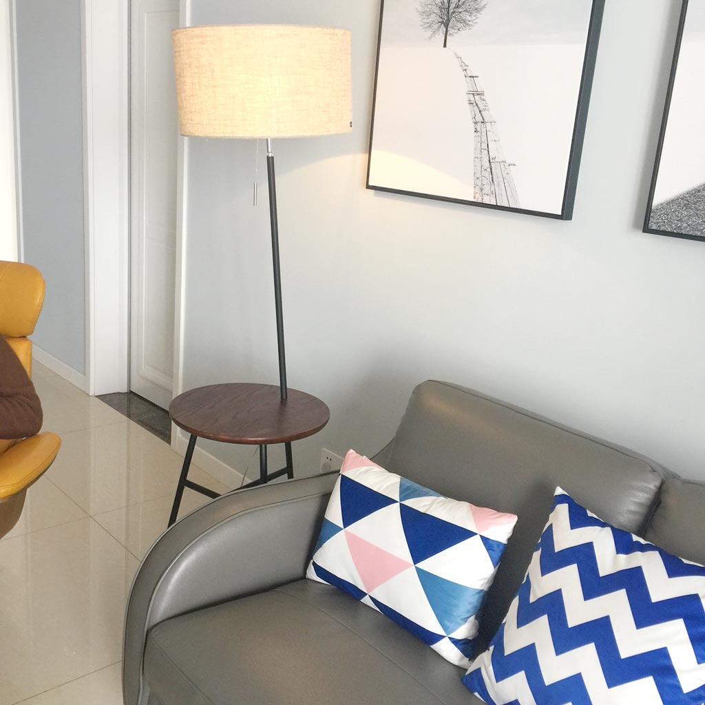 Điểm độc đáo nhất trên chiếc đèn này chính là phần kệ gỗ được đỗ bằng 3 chân hợp kim chắc chắn. Đặt cạnh sofa, chiếc đèn có thể sử dụng như một chiếc bàn nhỏ gọn để đựng các vật dụng thật tiện lợi. Bạn cũng có thể sử dụng phải phòng ngủ để thay thế cho chiếc bạn cạnh giường ngủ đấy.