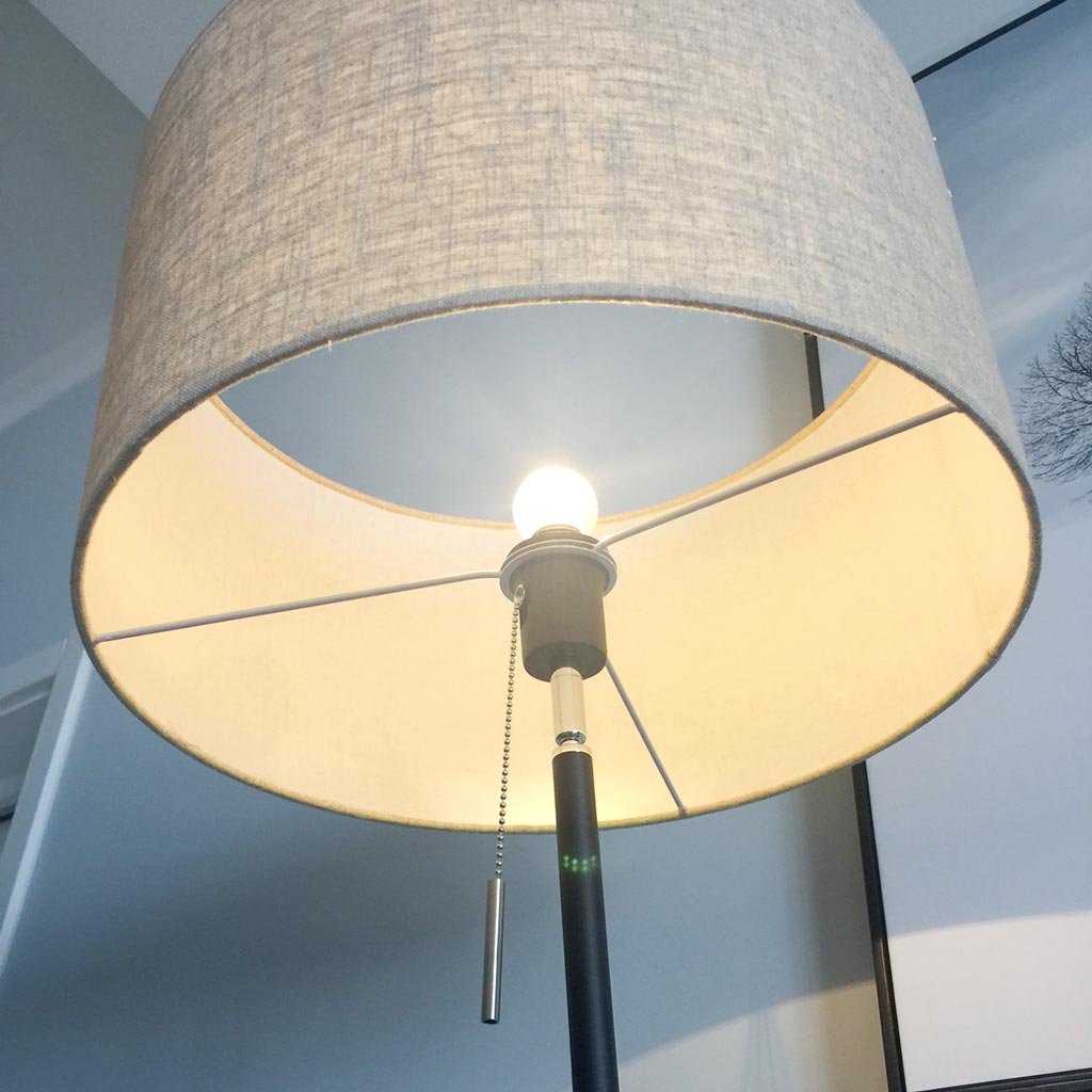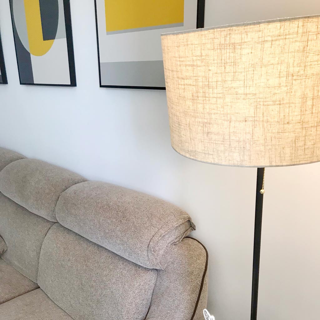 Chiếc đèn cây đứng sở hữu phong cách đơn giản, hiện đại và không kém phần sang trọng. Chụp đèn bằng vải cotton giúp làm mềm ánh sáng và định hướng chiếu xuống, rất thích hợp cho việc đọc sách.