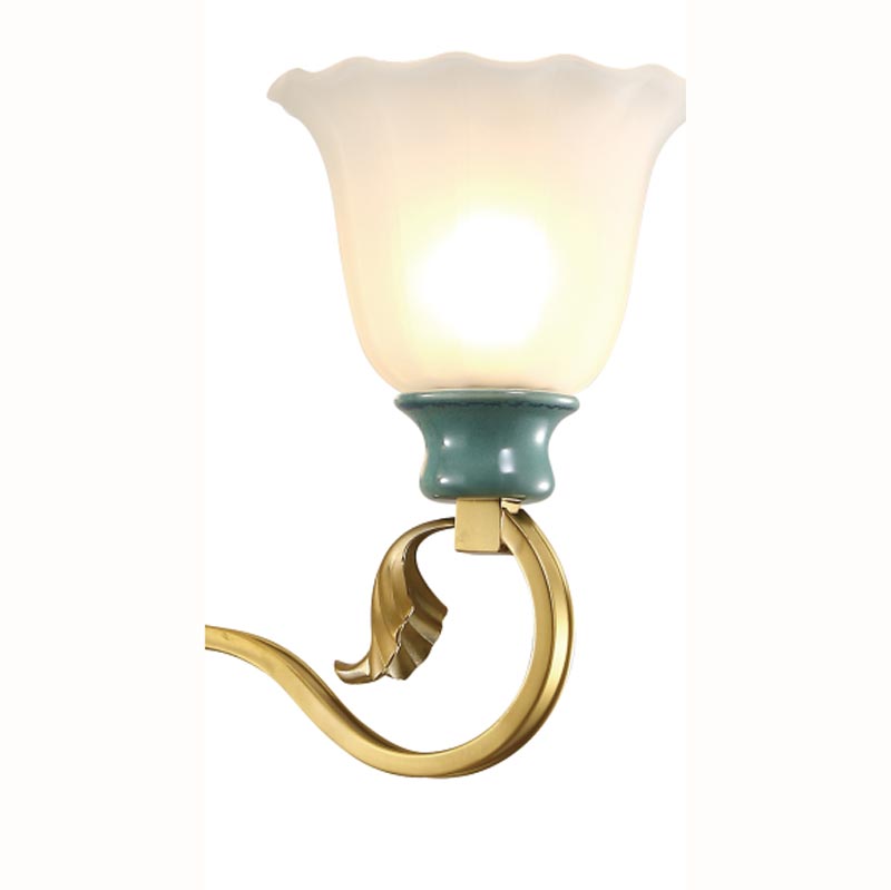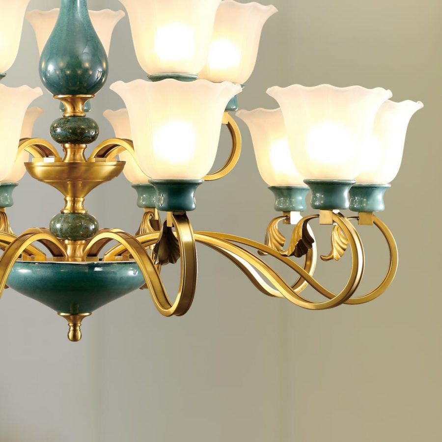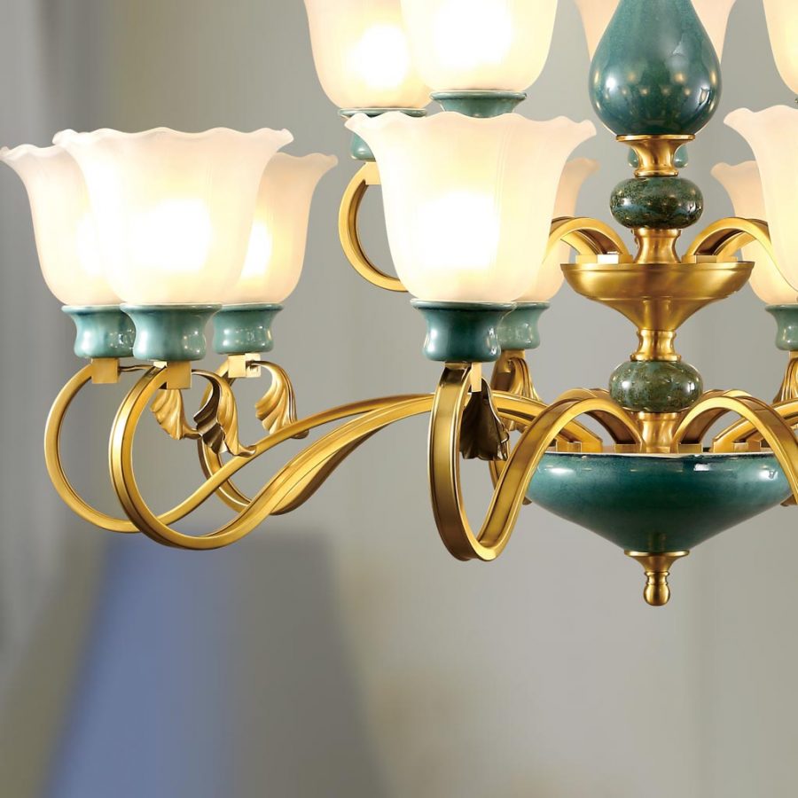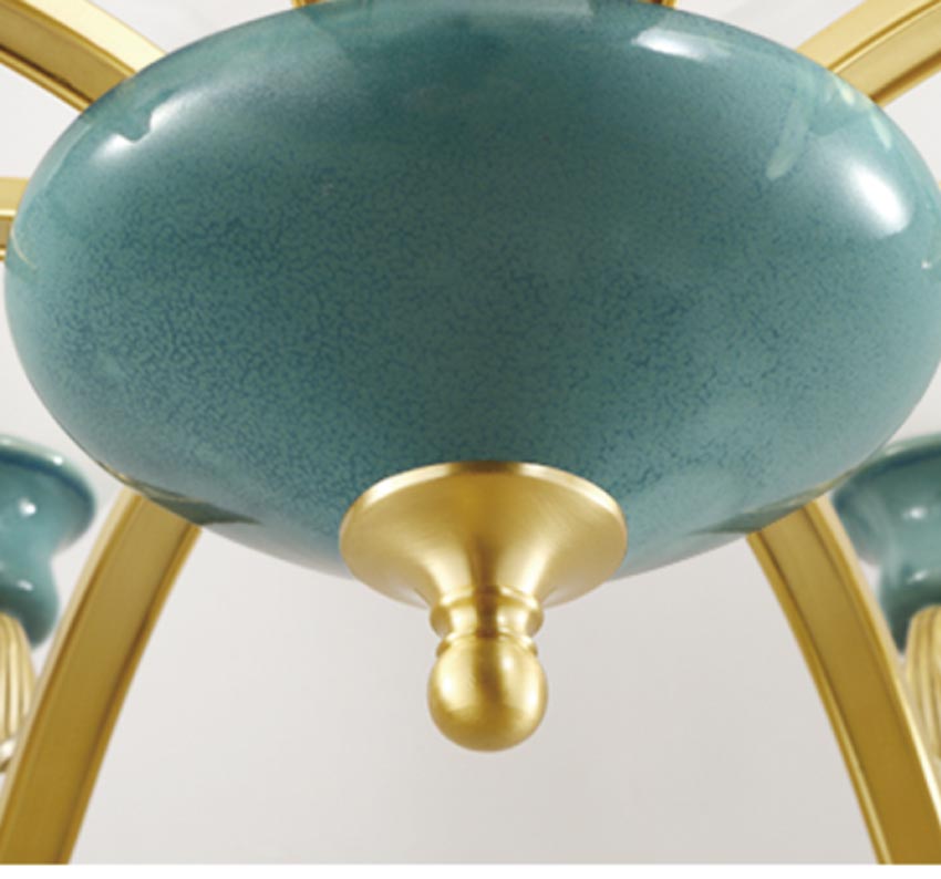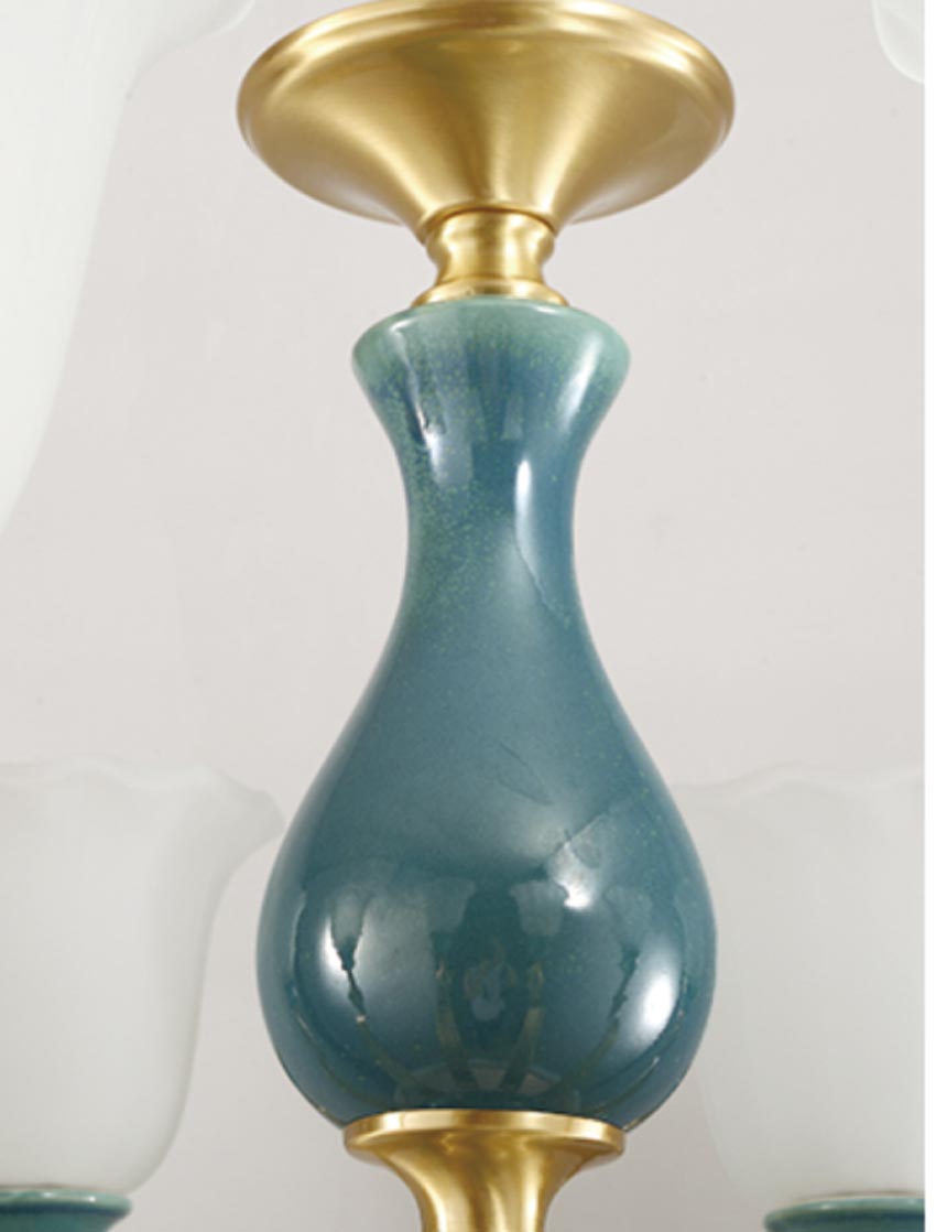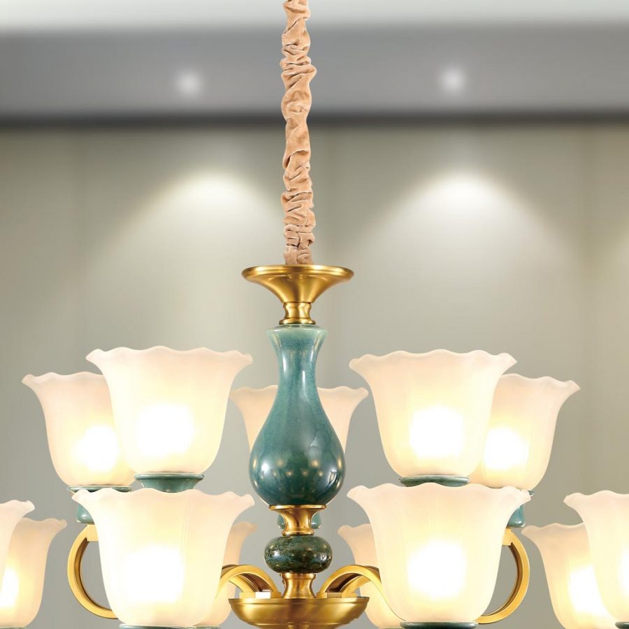 Đèn chùm có thiết kế khung đồng đẹp mắt với thiết kế gốm sứ màu xanh ngọc bích cao cấp, chao đèn hình bông hoa bằng thủy tinh trắng. Mẫu đèn chùm phòng khách cao cấp này chắc chắn sẽ đem lại không gian sang trọng, tiện nghi cho gia đình bạn.