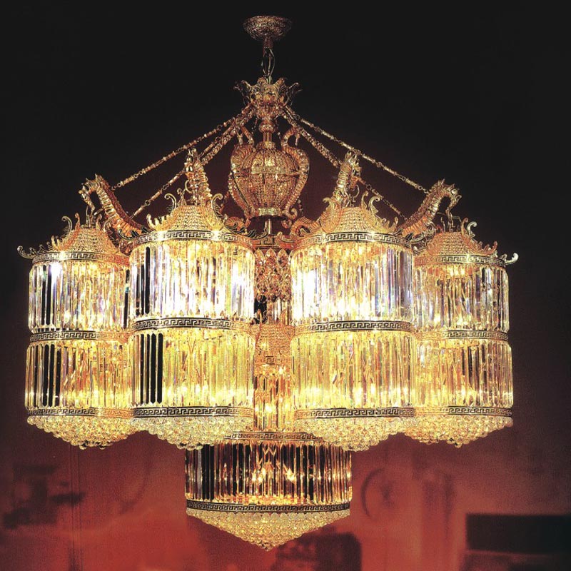 Lại một bộ đèn chùm pha lê có nhiều tay hình cá ngựa. Đèn kết cấu đơn giản được bao quanh bởi các trụ pha lê, nhưng rất riêng biệt vá sắc nét làm cho nó nổi bật so với các đèn chùm khác. Đèn thích hợp dùng cho nhà hàng, phòng đại sảnh của khách sạn, phòng khách lớn. Màu sắc của đèn là 24K, kết hợp với ánh sáng của đèn LED ba chế độ. Đây có thể nói là một trong những bộ đèn đỉnh của đèn chùm pha lê.