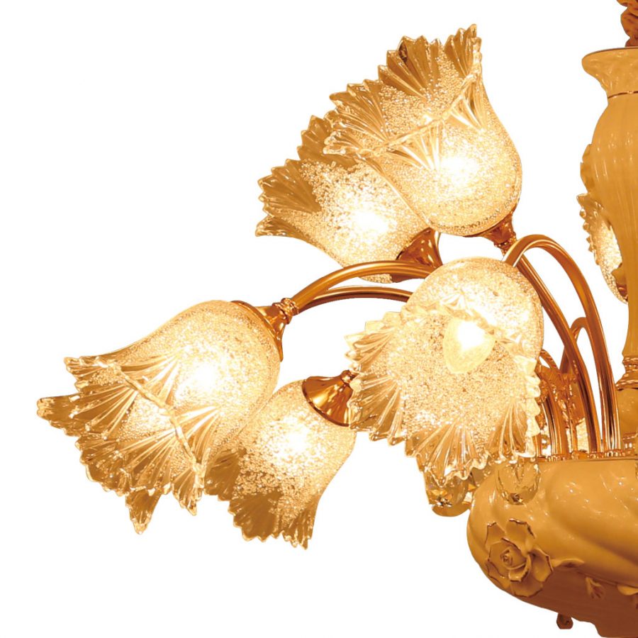 Đèn chùm có thân từ chất liệu gốm sứ và 12 tay đèn là các bông hoa thủy tinh cao cấp, đen đến vẻ đẹp sang trọng và rực rỡ cho không gian phòng khách của bạn. Đèn sử dụng 15 bóng đèn LED E14 tiết kiệm điện, chiếu sáng hiệu quả trong phạm vi đến 40m2 và được sử dụng như một đèn chiếu sáng chính lấp đặt ở trung tâm căn phòng.