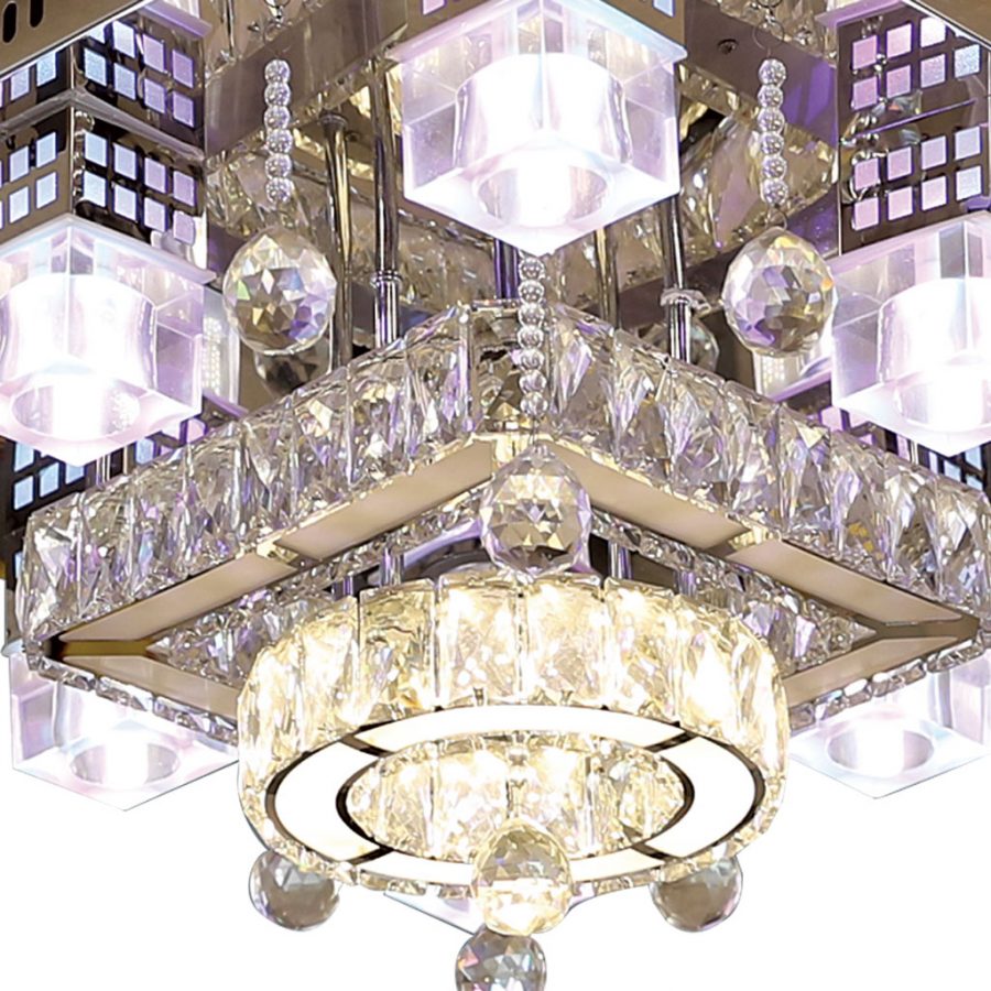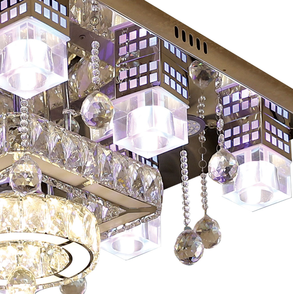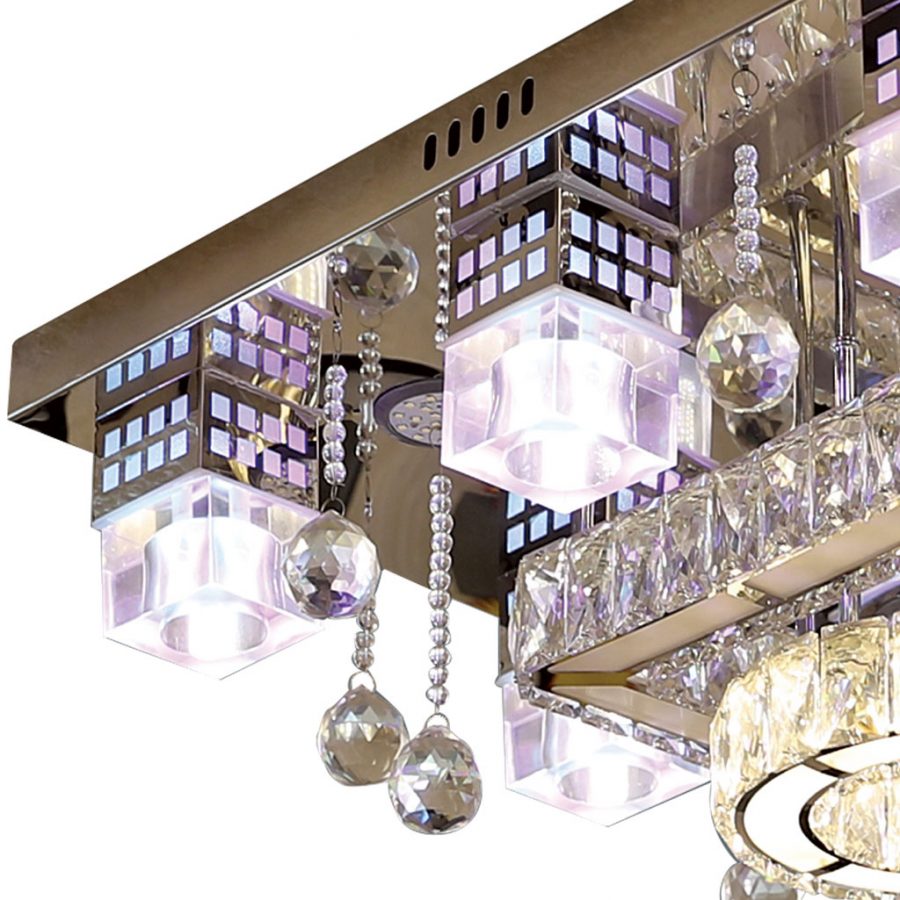 Đèn ốp trần sử dụng bóng đèn LED RGB cho phép tùy chỉnh nhiều chế độ màu sắc khác nhau. Các viên pha lê của đèn cũng đồng thời chiếu sáng theo các màu sắc thú vị. Đèn ốp có kiểu hình vuông với chiều dài và rộng 60cm.