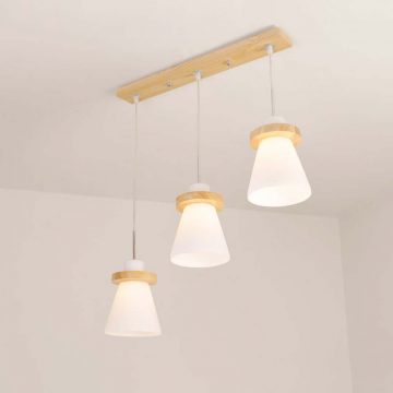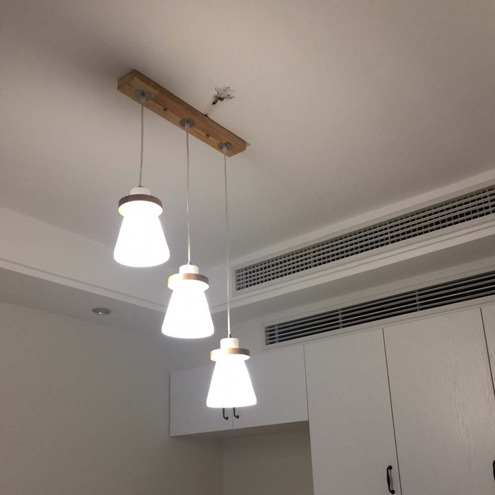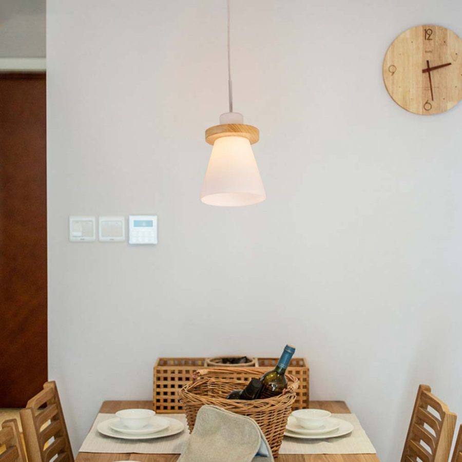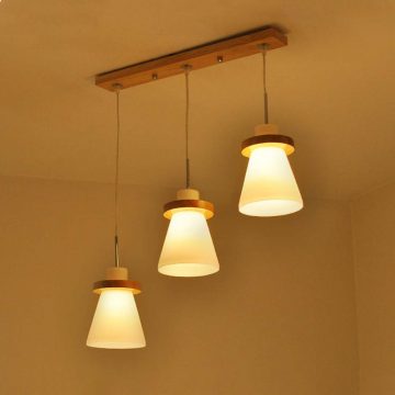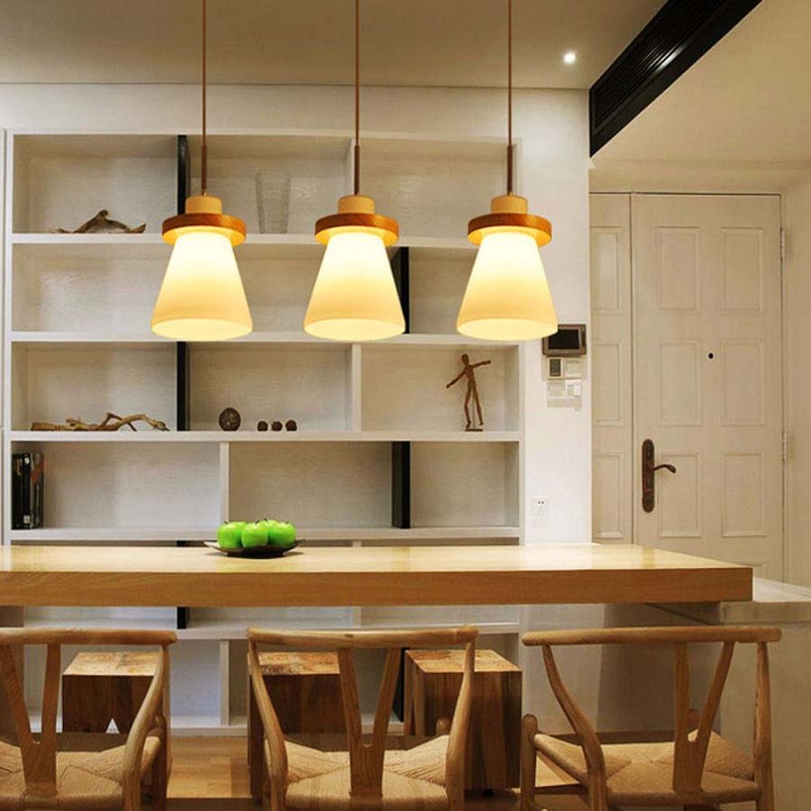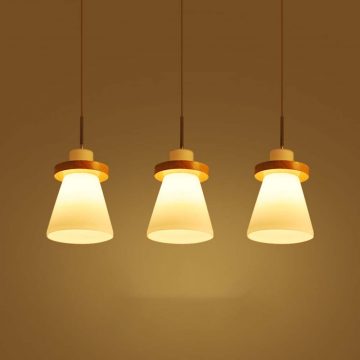 Đèn thả chiếu sáng bàn ăn hiện đại sử dụng các chao thủy tinh hình nón cao cấp. So với các loại chao khác thì thủy tinh sẽ đem đến cho bạn vẻ đẹp khác biệt. Chao thủy tinh của đèn dày, màu trắng đục, giúp ánh sáng truyền qua trở nên dịu nhẹ hơn. Đèn thả cho ánh sáng hướng xuống, được sử dụng phổ biến để chiếu sáng khu vực bàn ăn. Kiểu dáng đèn hiện đại, có phần chuôi được sản xuất từ gỗ tự nhiên, cũng như được thực hiện hoàn toàn bằng thủ công.