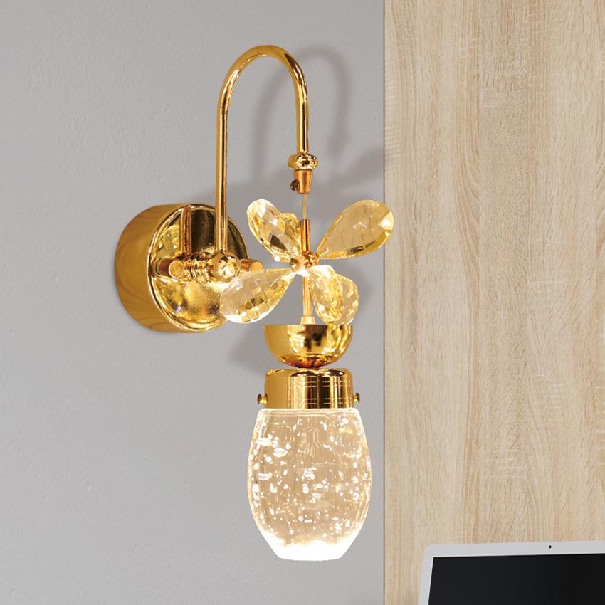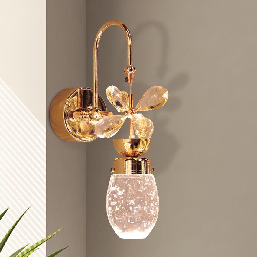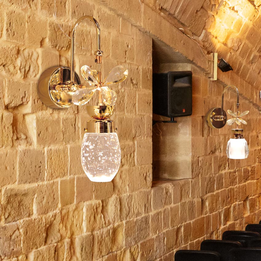 Đèn gắn tường trang trí cao cấp được thiết kế với chất liệu hạt pha lê nhân tạo K9, cùng khung hợp kim nhôm được sơn vàng bóng hiện đại. Đèn được sử dụng với mục đích chính là trang trí cho không gian, do đó chỉ cung cấp ánh sáng nhẹ, ấm áp. Phạm vi chiếu sáng của đèn chỉ trong phạm vi khoảng 1m2.
