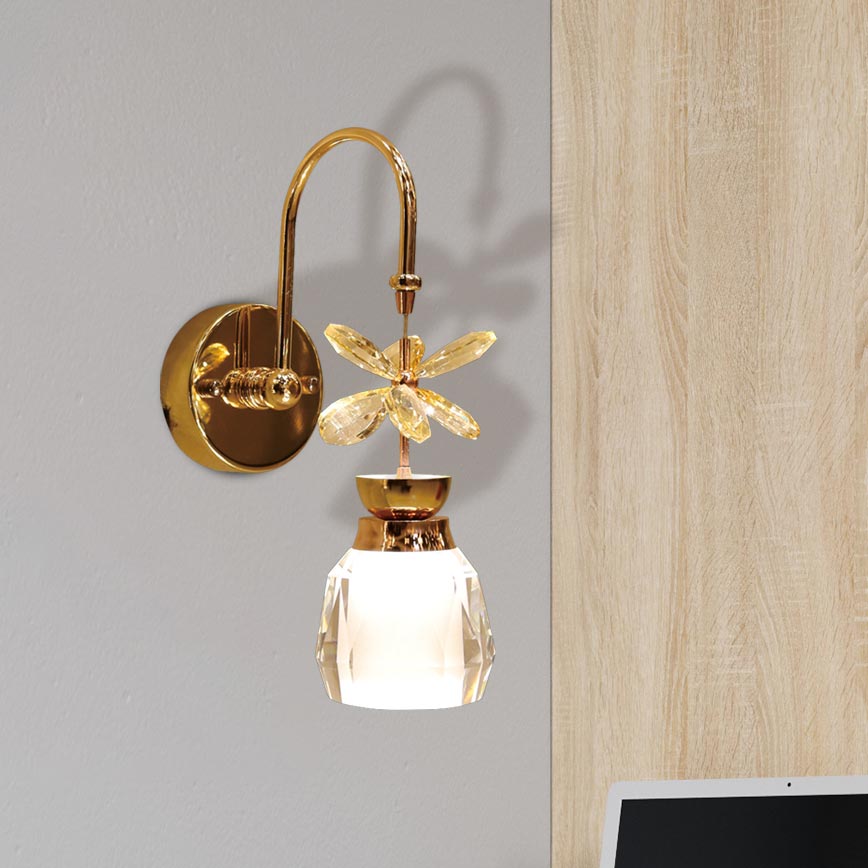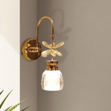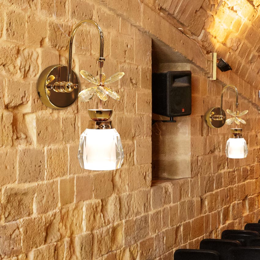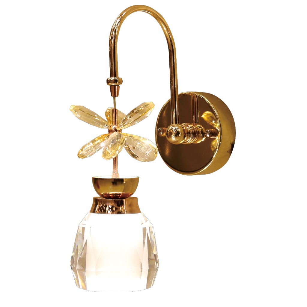 Đèn gắn tường trang trí cao cấp được thiết kế với chất liệu hạt pha lê nhân tạo K9, cùng khung hợp kim nhôm được sơn vàng bóng hiện đại. Đèn được sử dụng với mục đích chính là trang trí cho không gian, do đó chỉ cung cấp ánh sáng nhẹ, ấm áp. Phạm vi chiếu sáng của đèn chỉ trong phạm vi khoảng 1m2.