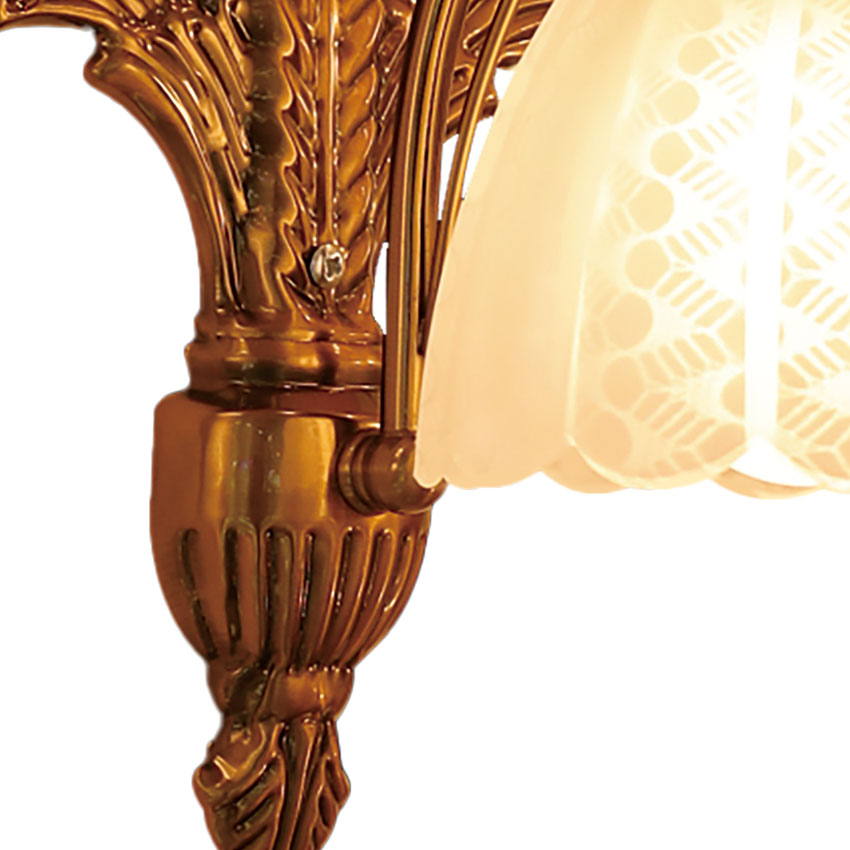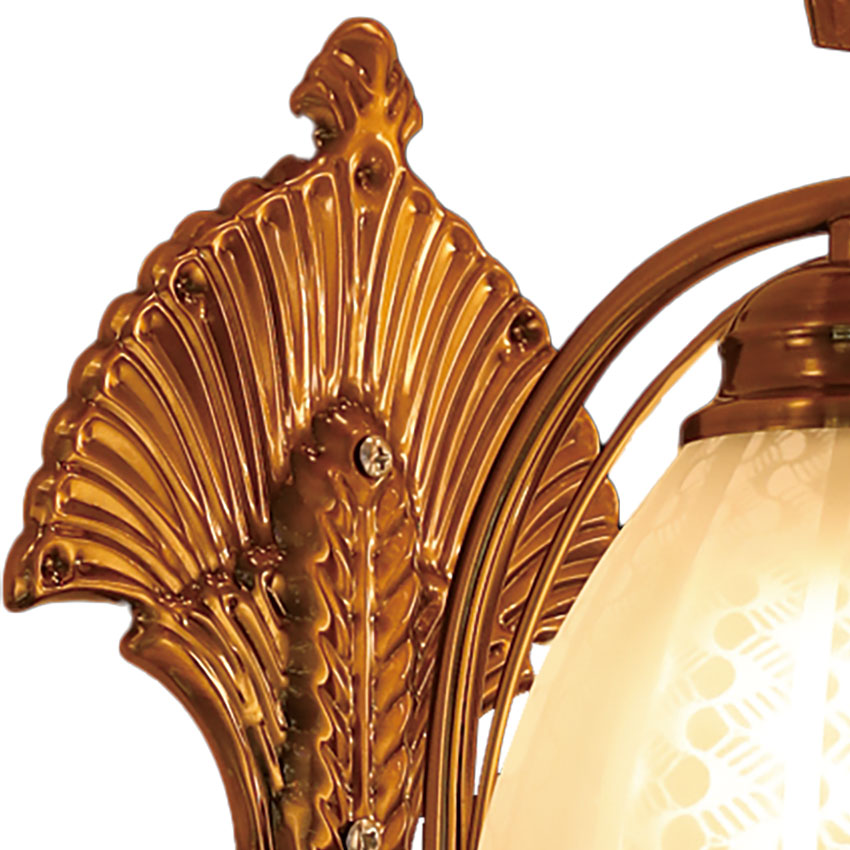 Chiếc đèn có thiết kế phần thân gắn tường hình đuôi công cổ điển và độc đáo. Phần thân được làm từ chất liệu kim loại giả đồng sáng bóng tạo vẻ sang trọng và uyền uy thịnh vượng. Chụp đèn được làm từ chất liệu thuỷ tinh với kiểu dáng đơn giản mà bắt mắt. Tất cả đều được gia công tỉ mỉ và hài hoà.