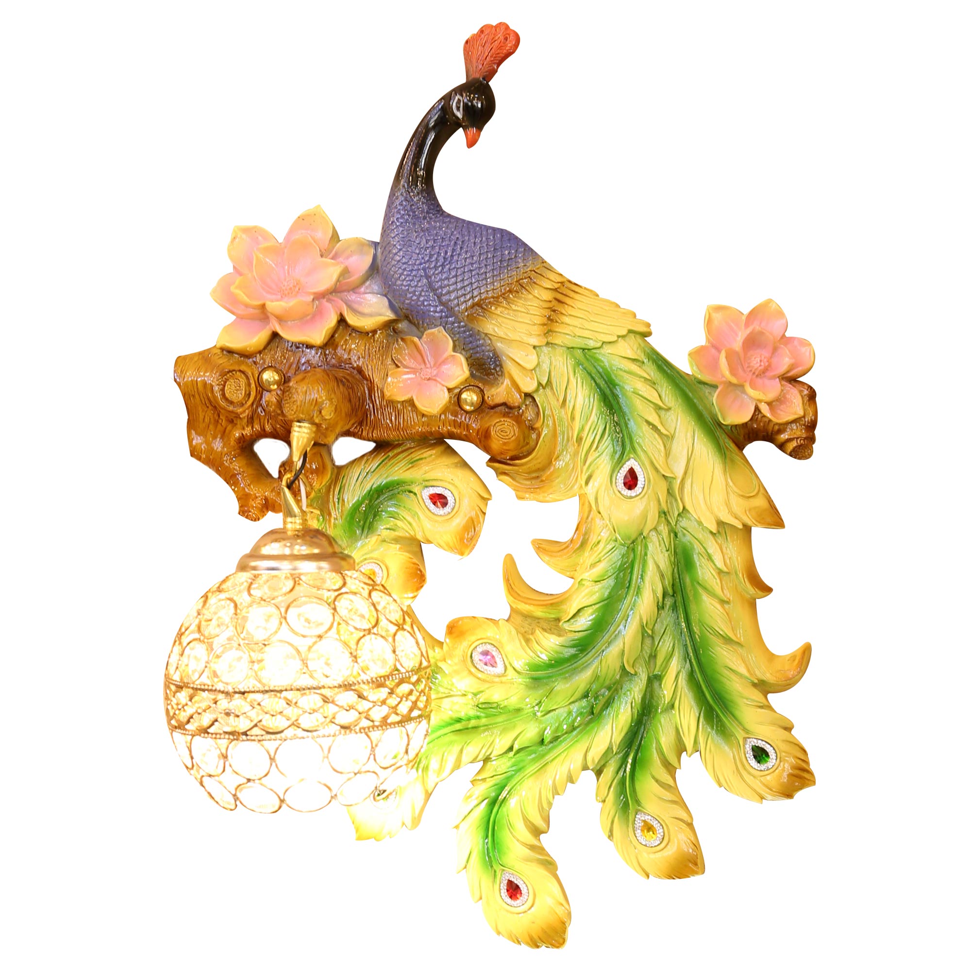 Mẫu đèn tường hình con công sử dụng chất liệu gốm, được đính các viên ngọc mã não tự nhiên, với tạo hình chim công đậu tên cành hoa rất sống động.