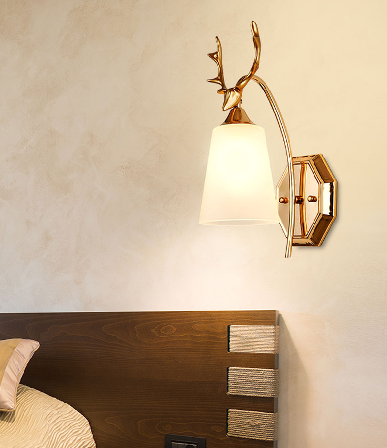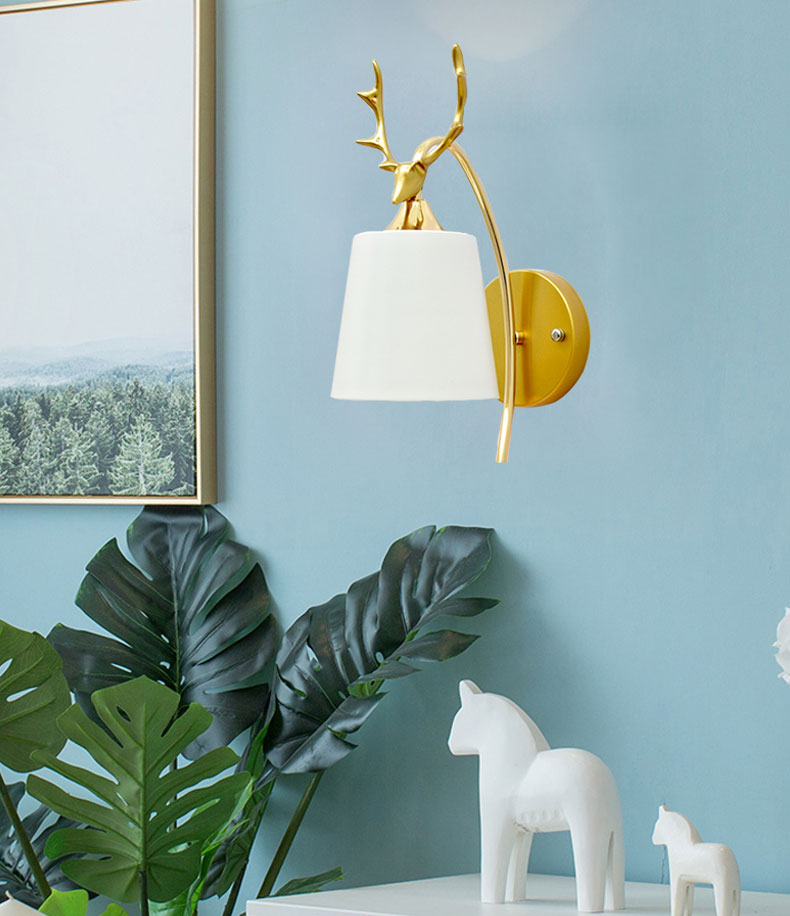 Mẫu đèn tường trang trí sử dụng chất liệu hộp kim nhôm hình đầu nai sừng tấm sang trọng. Thân đèn được sơn phủ màu vàng bóng. Nước sơn cao cấp và được sơn thủ công tỉ mỉ nên rất bền màu. Đèn thích hợp trang trí cho các không gian hiện đại, như tại các kệ bàn khu vực phòng khách, tường phòng ngủ, nhà bếp, hành lang… Hoặc tại các vị trí thiếu sáng.