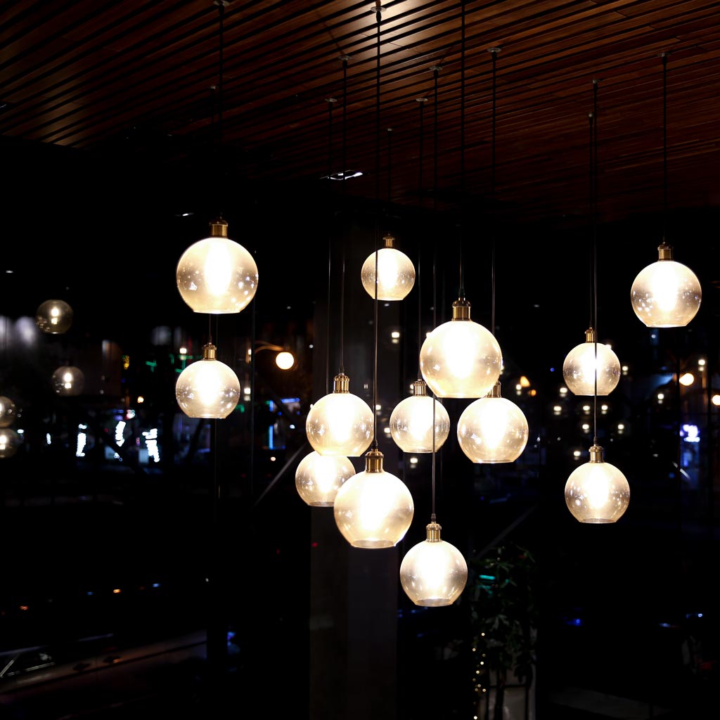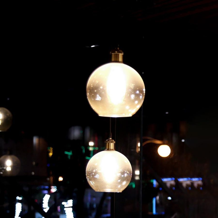 Mẫu đèn thả có thiết kế đơn giản với chao đèn thủy tinh hình quả cầu trong suốt, bên trong là bóng đèn dây tóc Edison tạo hiệu ứng ánh sáng vô cùng bắt mắt. Đèn chiếu sáng không quá mạnh, bạn có thể sử dụng để trang trí mà không làm phá vỡ bố cục chiếu sáng trong căn phòng. Ngoài bàn ăn, mẫu đèn này cũng được sử dụng nhiều tại đèn trang trí quán cafe, giúp đem lại khôn gian ấm cúng và riêng tư.