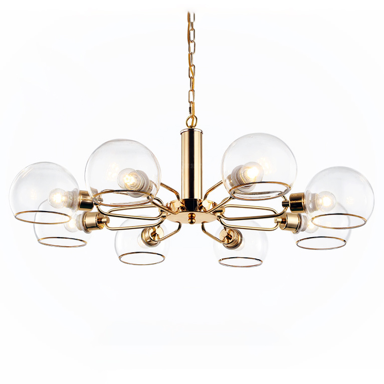 Đèn treo thả này có thiết kế các nhánh đều nhau toả ra tựa như những cánh hoa đang bung nở rất đẹp. Chao thuỷ tinh trong suốt được lắp đặt hở úp hướng xuống phía dưới cho ra hiệu ứng ánh sáng đẹp mắt. Ánh sáng vàng ấm mà đèn mang lại sẽ khiến bạn vô cùng bất ngờ bởi sự dễ chịu và mềm mại. Đèn vẫn rất đẹp ngay cả khi không được thắp sáng bởi có thiết kế vô cùng tinh tế và sang trọng. Đèn được làm từ chất kiệu hợp kim cao cấp mạ vàng sáng bóng làm sáng bừng cả gian phòng của bạn, các mấu nói chi được lắp đặt rất tỉ mỉ và chau chuốt tạo nên một tổng thể vô cùng hoàn hảo.