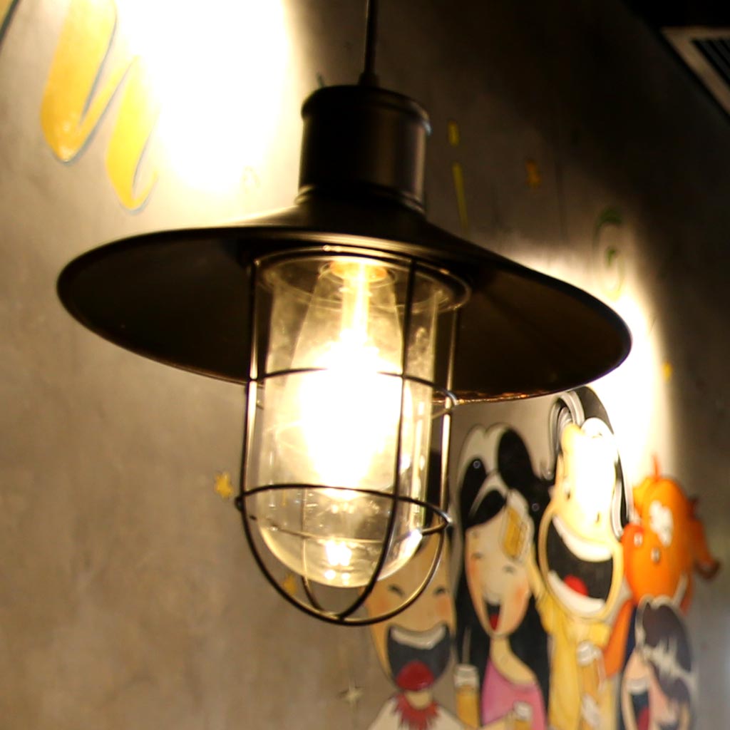 Mẫu đèn thả có thiết kế đơn giản với vật liệu chính là hộp kim nhôm sắt sơn đen. Bên trong đẻn là chao đèn thủy tinh có nhiệm vụ giúp làm mềm ánh sáng, ánh sáng tỏa ra từ đèn dịu nhẹ và không gây khó chịu cho mắt. Nhờ khả năng đem đến ánh sáng ấm áp, cùng màu sắc hiện đại nên mẫu đèn này rất dễ bày trí cho nhiều phong cách quán cafe khác nhau. Ngoài ra, bạn cũng có thể trang trí đèn cho khu vực ban công nhà, mái vòm…