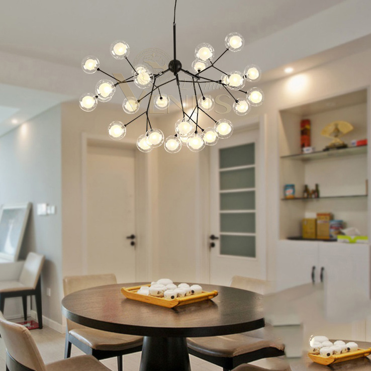 Đèn chùm bóng thuỷ tinh có số lượng lên đén 27 bóng được tạo hình xoay chuyển theo những hướng ngẫu nhiên, giúp hiệu ứng lan toả ánh sáng đẹp mắt vào những khu vực xung quanh. Do có số lượng bóng nhiều nên đèn thích hợp để trang trí trong phòng khách, phòng khách, bàn ăn trong không gian có diện tích rộng rãi thoải mái và trần nhà không quá thấp tránh tạo cảm giác ngột ngạt.