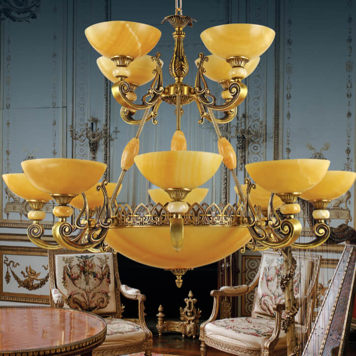 Đèn chùm đồng Chao đá 12 Bóng Venus YD003/12 có vẻ đẹp vô cùng tuyệt vời để thắp sáng và trang trí cho ngôi nhà thân yêu của bạn. Ánh sáng từ đèn trang trí như một vật trang sức không thể thiếu cho bất kỳ không gian hoàn hảo nào.